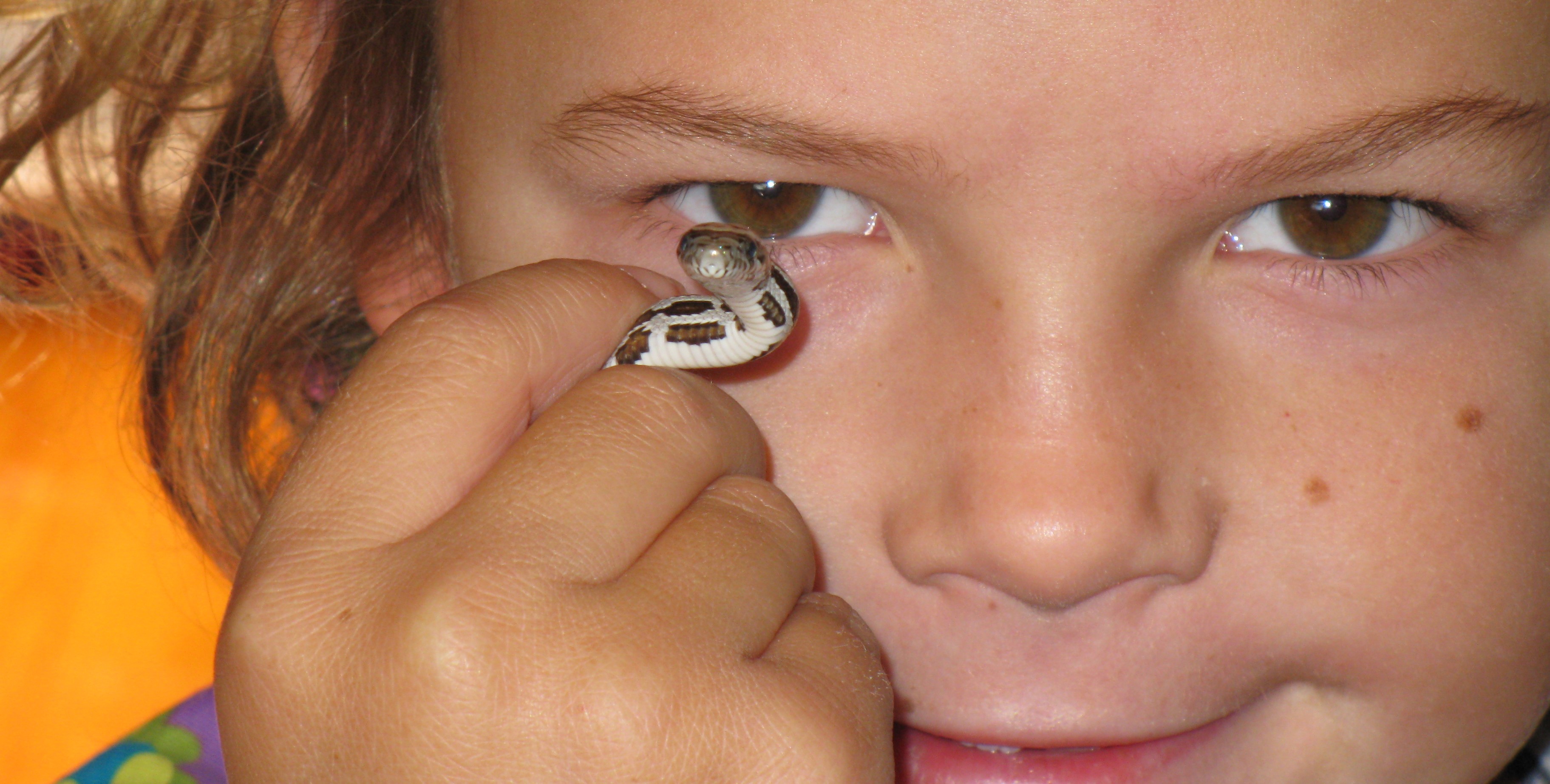 Sheena’s the corn snake we got when Sophie was five. After attending Strawberry Hill Nature Camp, Sophie became obsessed with owning a snake. We asked around town and learned that Nathan, the amiable kid who ran the bakery stand at the downtown farmers market, also bred snakes. As we bought our shoo-fly muffins one Saturday morning, we set up an appointment.